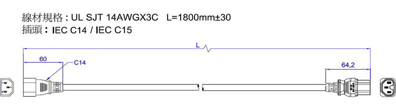 產品目錄 > 機房電源管理 > 電源線、轉接線 電源轉接線 型號:1.8M C14/C15 1.8米 15A IEC C14插頭 轉C15 插座,台灣製造 產品介紹 產品應用圖 產品功能 IEC C-14電源插頭轉 C-15插座 最大工作電流 15安培 (AC125V) 適用工作電壓 AC125V (15A) 或 250V (10A) 電線芯徑規格: 14AWG x3C 通過 UL安規認證 耐熱:105℃ 全長 1.8米 ( 另可接受 10米以內訂製長度 ) 台灣製造